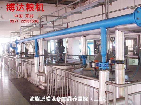 将脱臭后的油脂(温度在 50℃以上)移入有冷却装置的结晶养晶罐,慢速搅拌,在常压下充分冷却,整个冷却结晶时间为48h,然后过滤分离油、蜡质。过滤压强维持在 0.3–0.35MPa,过滤后要及时用压缩空气吹出蜡中夹带的油脂,滤出的油即为脱蜡成品油。